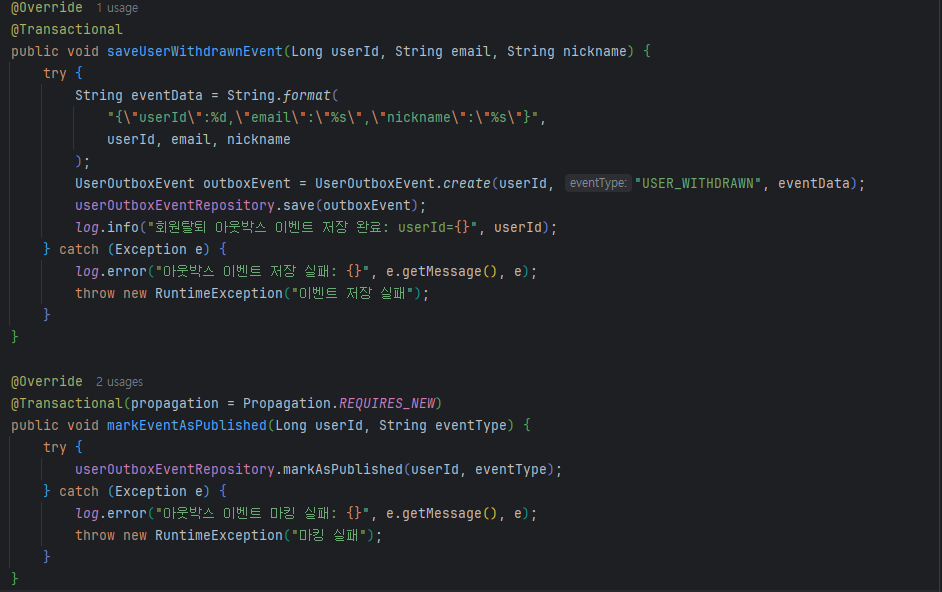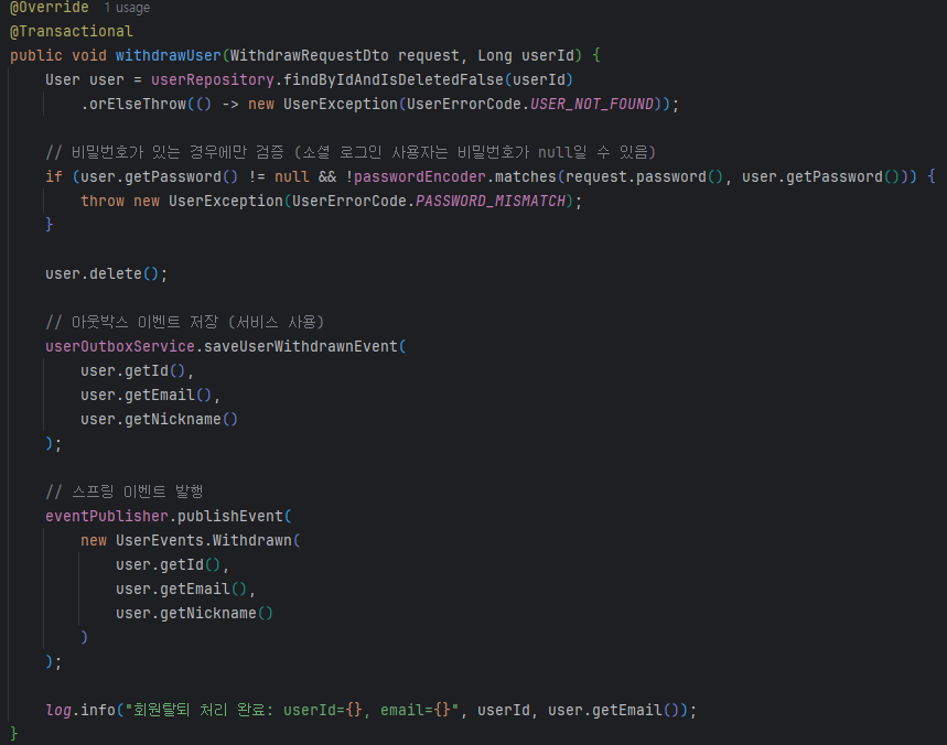 회원탈퇴 처리 시 비즈니스 데이터 변경과 아웃박스 이벤트 저장을 같은 트랜잭션으로 처리합니다.