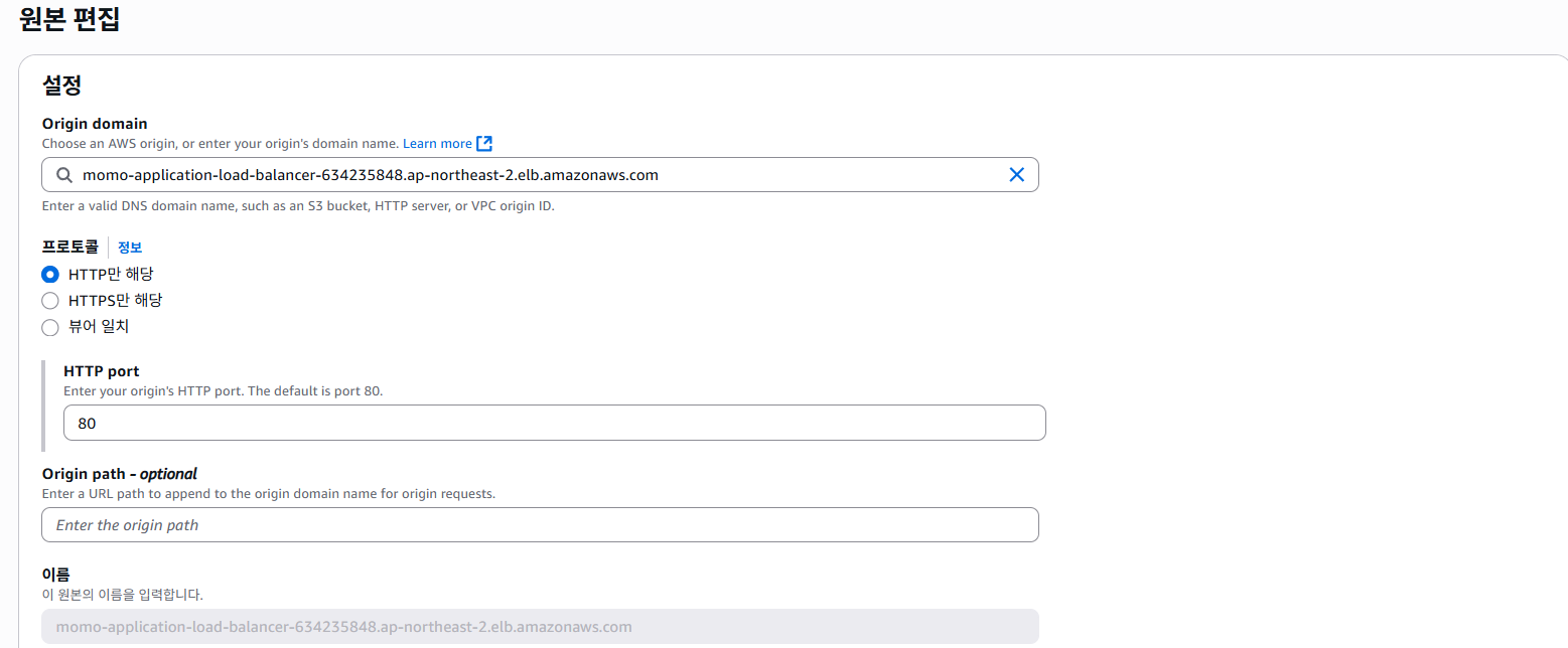 현재 ALB는 별도의 DNS 를 구매하지 않아서 ACM 인증서가 없는 관계로 http 만 열려있습니다. 그래서 CloudFront <-> ALB 사이에서 프로토콜을 HTTP만 해당으로 변경해줍니다.
