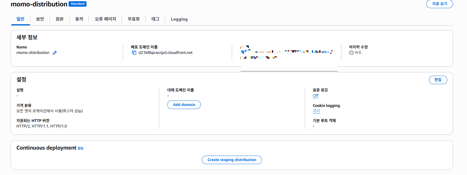 사용자가 https://d21k8bpracnjzd.cloudfront.net으로 요청하면 CloudFront가 HTTPS(443포트)로 요청을 받습니다. 이때 CloudFront의 자체 SSL 인증서를 통해 암호화된 연결이 이루어집니다.