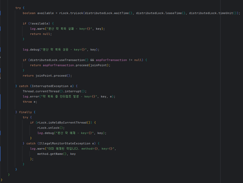 핵심 AOP 로직에서는 tryLock()을 사용했습니다. lock()처럼 무한 대기하는 방식은 서비스 가용성 측면에서 위험할 수 있어, 일정 시간 대기 후 실패하면 다음 시도로 넘기도록 설계하는 편이 더 안전하다고 판단했습니다. 락을 안전하게 해제하기 위해서는 isHeldByCurrentThread() 체크를 통해 현재 스레드가 락을 보유하고 있을 때만 unlock()을 호출하도록 했고, IllegalMonitorStateException을 잡아서 로그로 남기되 시스템 흐름을 깨지 않도록 했습니다.