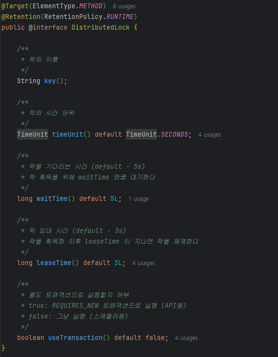 먼저 락 키는 정적 문자열이 아니라 SpEL을 통해 동적으로 생성할 수 있게 했습니다. 이를 통해 API 요청이나 스케줄러별로 식별자를 유연하게 만들 수 있습니다. 그리고 락을 얻기 위해 기다리는 최대 시간(waitTime)과 락을 자동 해제하는 시간(leaseTime)을 옵션으로 열어두었습니다. waitTime이 너무 길면 요청이 블로킹되므로 짧게 설정하고, leaseTime은 작업이 정상적으로 완료될 것으로 예상되는 시간보다 약간 여유 있게 잡는 것이 안전합니다. 마지막으로 API에서 트랜잭션 처리를 별도로 하고 싶을 때를 대비해 useTransaction 플래그를 두어, 트랜잭션 커밋 시점과 락 해제 시점을 조절할 수 있게 했습니다.