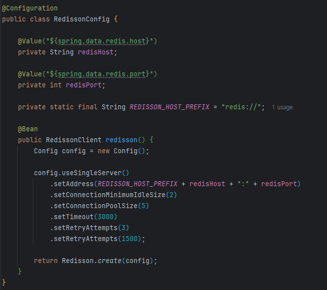 Redisson을 적용하려면 먼저 의존성 추가와 설정이 필요합니다. spring-boot 프로젝트에서는 Redisson 클라이언트를 빈으로 등록해 두면 편리하게 재사용할 수 있습니다. 설정에서 특히 고민한 값들은 connectionPoolSize, timeout, retryAttempts, retryInterval 같은 항목들이었습니다.