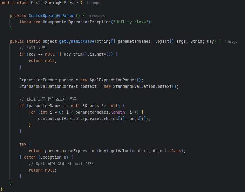 SpEL 파싱은 CustomSpringELParser로 분리했고, 파싱 실패 시 null을 반환하도록 했습니다. 호출부에서는 null 결과를 명확한 예외로 처리해 문제를 빨리 발견할 수 있도록 했습니다.