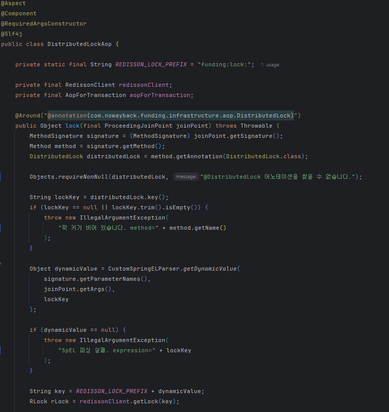 그래서 저는 이런 공통 로직을 AOP로 분리하여, 애플리케이션 전반에서 간단하게 락을 적용할 수 있는 구조를 만들었습니다.