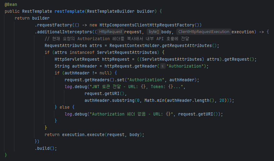 - 자동화: 모든 RestTemplate 호출에 자동으로 JWT 토큰 전달
