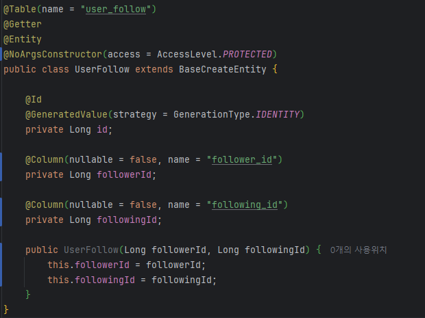 이를 해결하기 위해 UserFollow 엔티티에 양쪽 ID를 모두 포함했습니다: