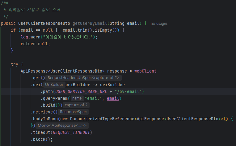 UserClientResponseDto user = userClient.getUserByEmail(email); // WebClient 호출