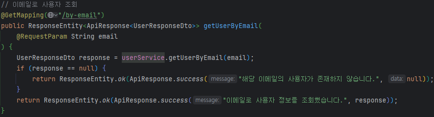 User 도메인에 이메일 기반 조회 API를 추가했습니다:
