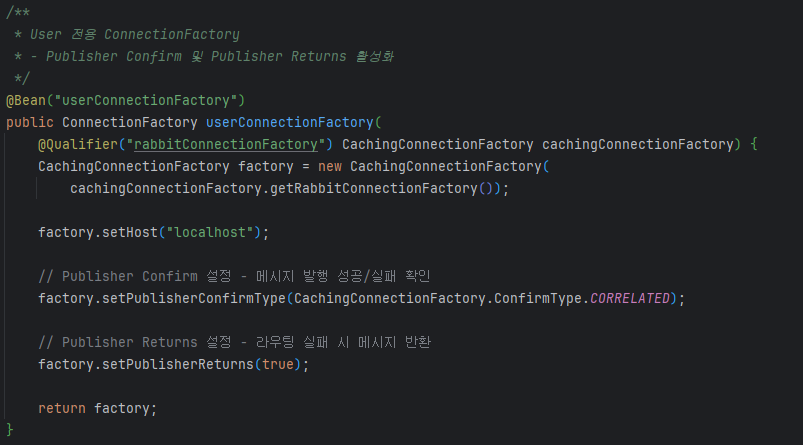 해결: 기본 ConnectionFactory의 getRabbitConnectionFactory()를 통해 연결 정보를 상속받도록 구현했습니다.