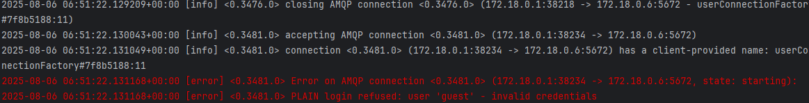 - RabbitMQ 연결 정보가 설정되지 않아 기본값(guest/guest)이 사용됨