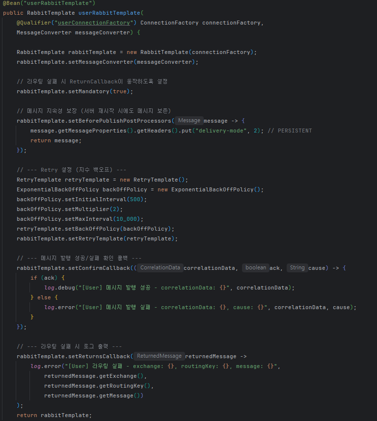 Publisher Confirm이 활성화된 전용 RabbitTemplate을 구성합니다: